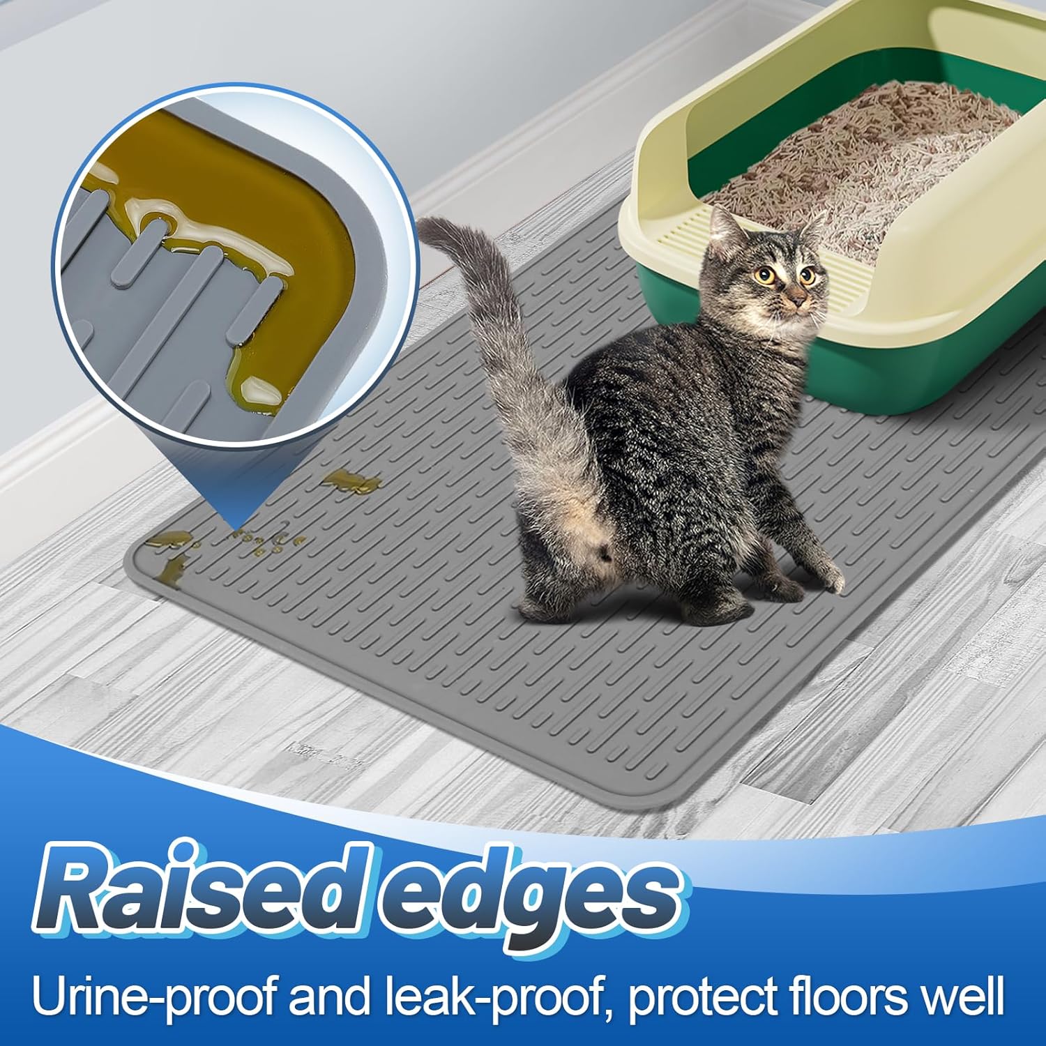 - WATERPROOF: With raised edges and a 3mm thickness, this cat litter box mat for floor contains liquids such as urine, preventing spills from reaching the floor. It protects your flooring from damage while making cleanup quick and hassle-free—ideal for families with pets.
