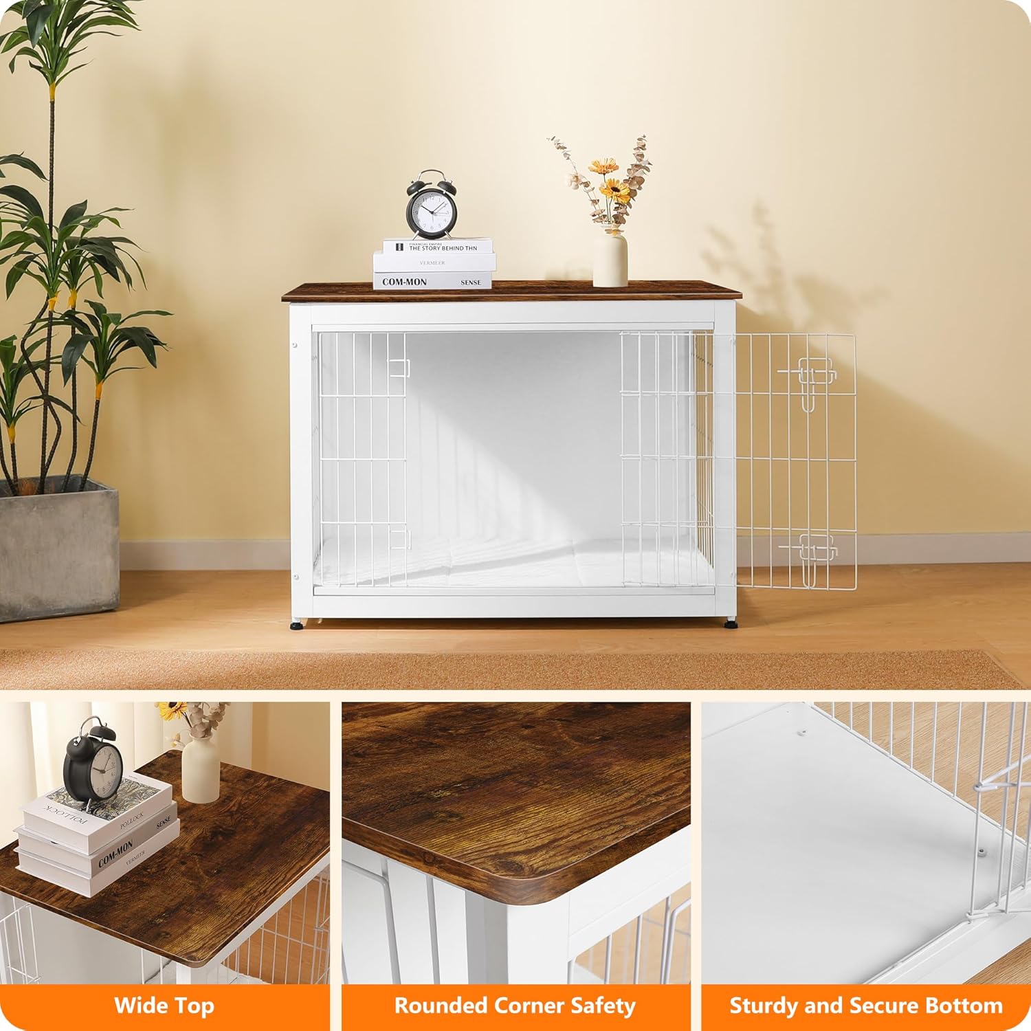 DWANTON Dog Crate Furniture with Cushion, Wooden Kennel Table with Double Doors, Indoor Dog House, Large Size, 38.5" L, White+Rustic Brown