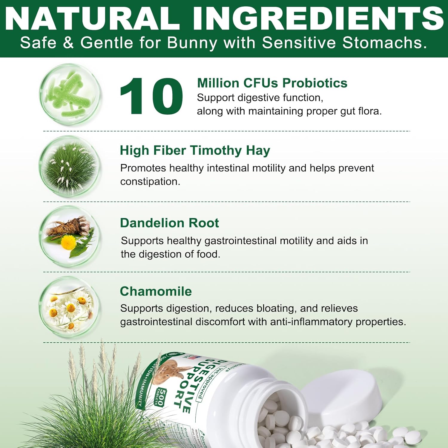 500 Tablets, Digestive Support Rabbit, Support GI Stasis, Bloat, Constipation, and Diarrhea, Strengthens Immune System, Premium Formula with High Fiber, Vitamins and Probiotics, Non-GMO