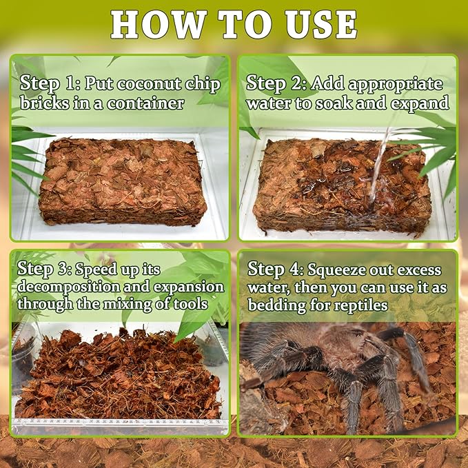 - What You Will Receive: You will get 6 PCS in 1.1 LB compressed coco coir chip brick. It will expand into loose coco chips after water absorption, each loose coco chips is about 10 mm~35 mm, which is an ideal coconut substrate for reptiles