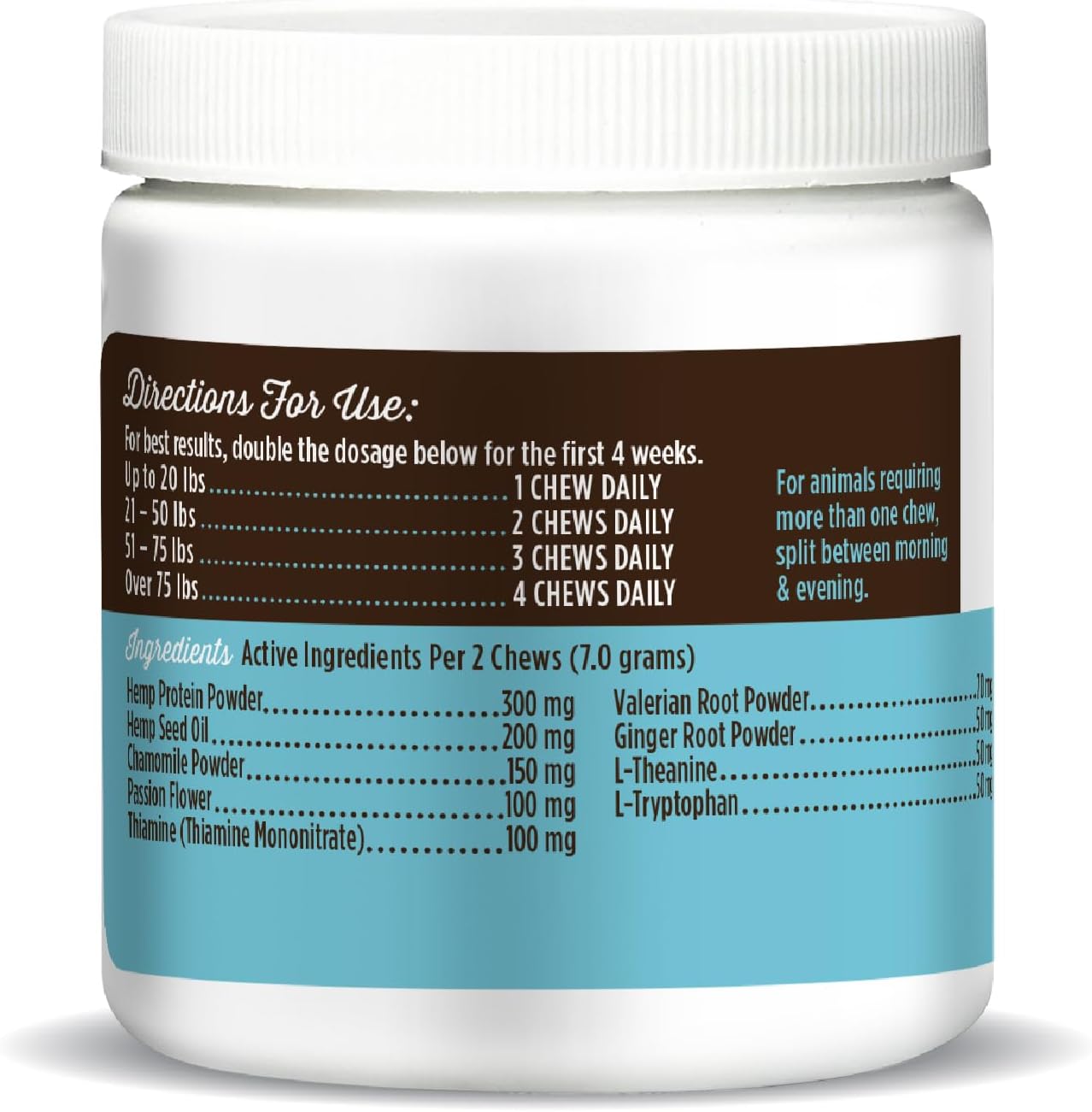 - Effective, All-Natural Ingredients - We load our calming treats with wholesome and effective ingredients like Chamomile, Theanine, L-Tryptophan and more. Valerian root is a homeopathic herb that can help relax your dog, put his fears to rest, and promote a sense of tranquility. We include only natural pet hemp for it's support of nervous system function. Omega 3 & 6 fatty acids for heart health, flexibility, and comfort, and Pre and Probiotics for optimal digestion.