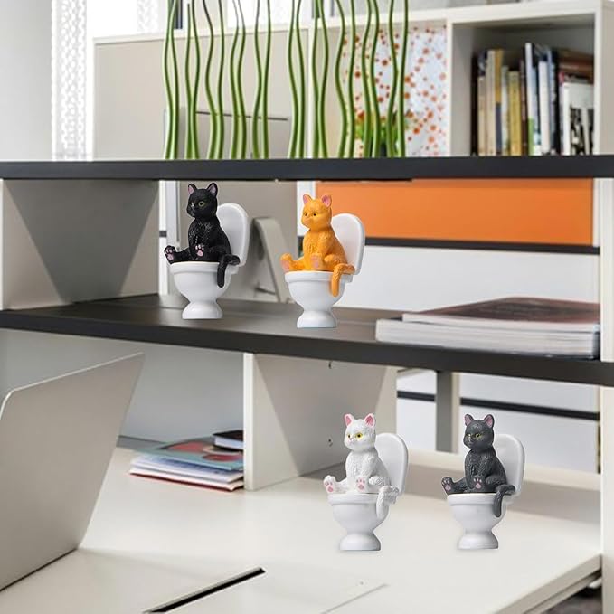 - DESIGN: Whimsical miniature cat figurine depicts a feline perched on a toilet, crafted from durable resin material for long-lasting display