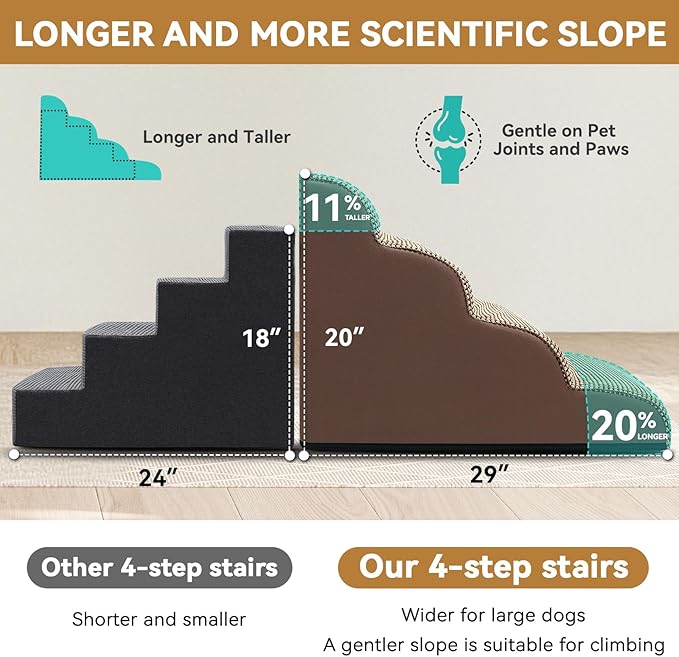 - Specific & Durable Design: Low angle slope design reduces the pressure on joints when pets jump up and down from high bed, sofa, chair and car. Portable handle makes moving stairs easily at home or taking a trip with your pet. The non-slip bottom keeps the stair firmly planted on the ground. No more worrying about your pet slipping and getting hurt! Our foam stair is an essential part of your beloved pet's life! It combines functionality, safety, and durability in one stylish package!