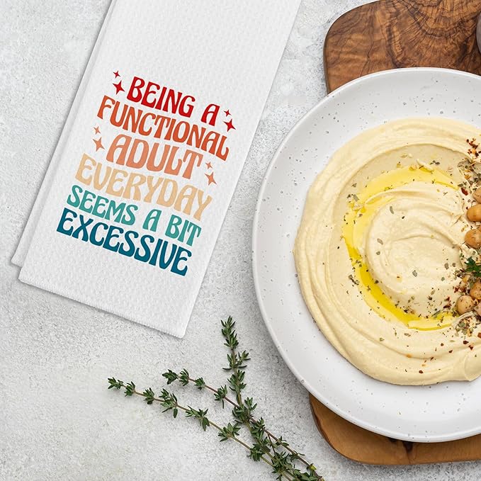 - Unique Design: Our funny kitchen towel with saying "Being A Functional Adult Every Day Seems A Bit Excessive". The simple yet cute text patterns can bright up your kitchen and surprise your family and friends. It's a perfect kitchen gift for your favourite chef.