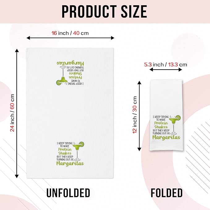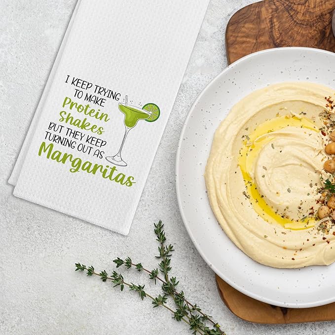 - Unique Design: Our funny kitchen towel with saying "I Keep Trying to Make Protein Shakes But They Keep Turning Out as Margaritas". The simple yet cute text patterns can bright up your kitchen and surprise your family and friends. It's a perfect kitchen gift for your favourite chef.