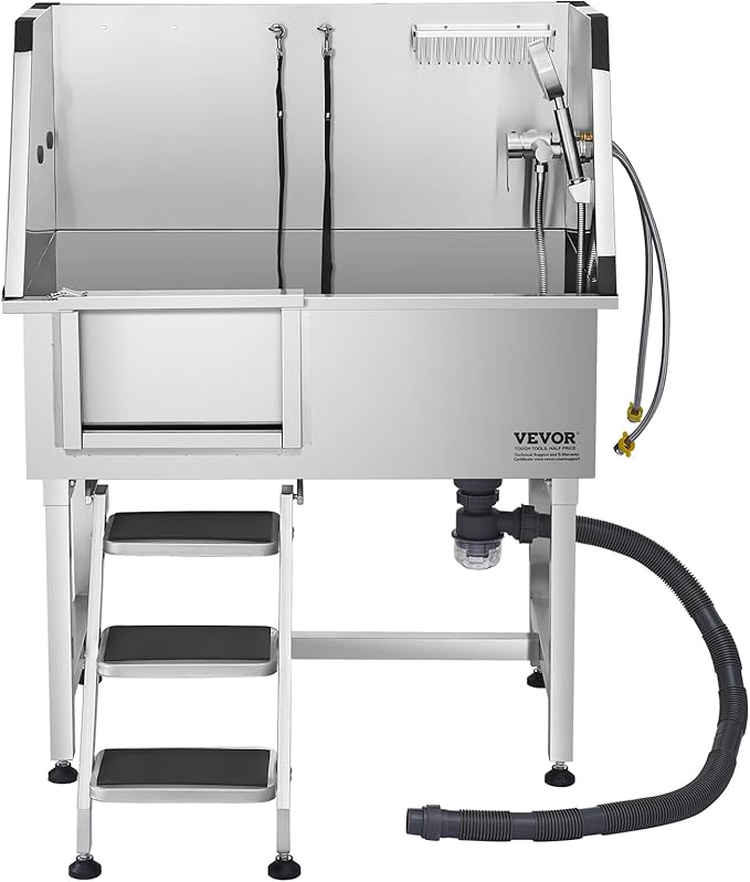 - Integrated Design: The dog grooming tub is featuring hot and cold faucets, a dual-control showerhead, and a soap holder, this design makes pet bathing effortless and efficient. The PE water filter board provides a non-slip draining surface, while the included duckbill buckle stops pets from accidentally triggering the door during bath time, keeping them securely inside