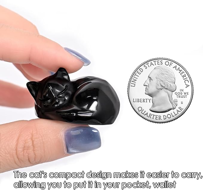 WHAL&YUNE Crystal Cat Figurine, 1PC Black Obsidian Cat, Natural Sleeping Cat Ornament Hand Carved Cat Statue Cat Home Decor Crystal Decoration for Cat Lovers, Gift 1.5"