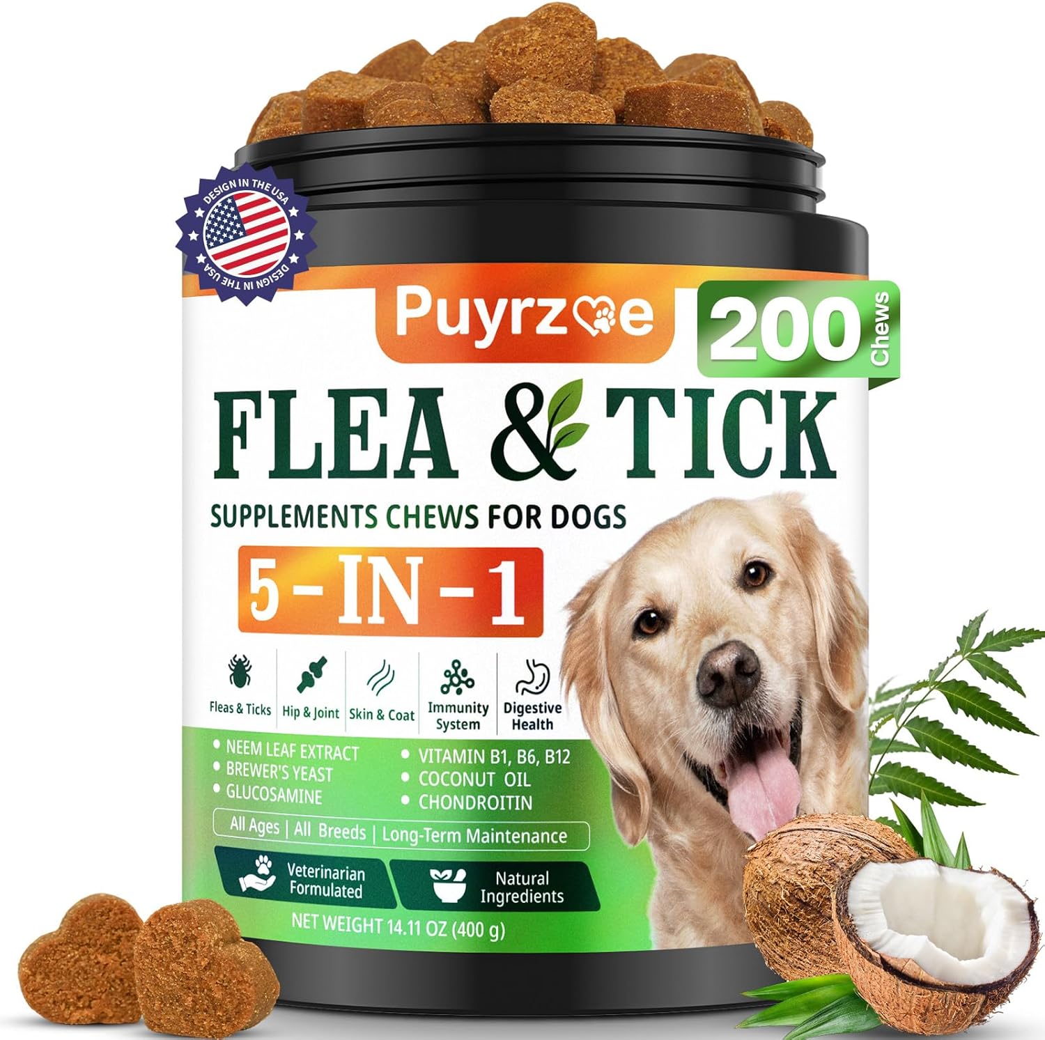 - Natural 5-in-1 Flea & Tick Defense: Puyrzoe Natural 5-in-1 Dog Flea and Tick Treatment Chewables feature unique and natural ingredients, including Neem, Brewer's Yeast, Glucosamine, Chondroitin, and Vitamin B. This daily supplement not only helps support a natural balance approach to flea and tick care, but also supports immune health and joint health. Especially suitable for active outdoor dogs and seniors, helping them soothe itching and enjoy natural protection.