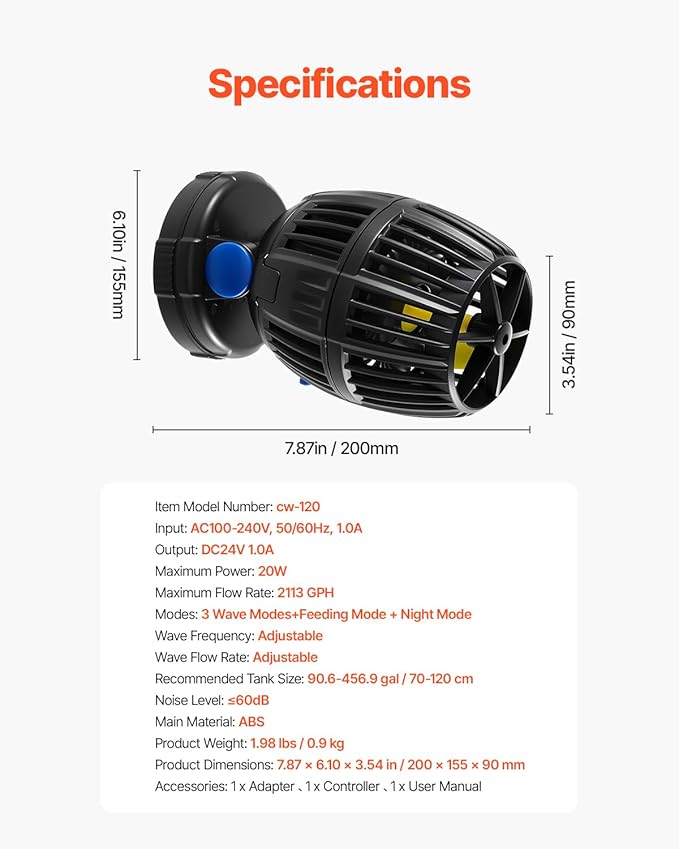 - Compact & Efficient: Designed for efficiency, our small yet powerful fish tank wave maker delivers up to 2113 GPH with only 20W of power consumption. Ideal for 50-70 cm aquariums, it operates securely with a 24V DC low-voltage power supply