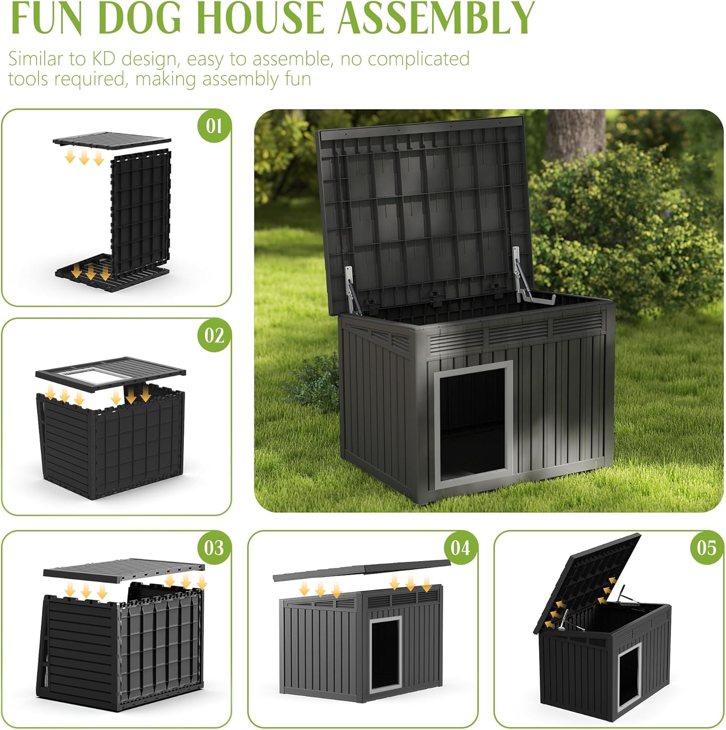 Dog House Indoor Outdoor,Resin Waterproof Puppy Shelter with Air Vents and Elevated Floor,Air Rod on Top to Open,Dog Kennel for Small to Large Dogs(Black,42.87 * 32.95 * 31.61)