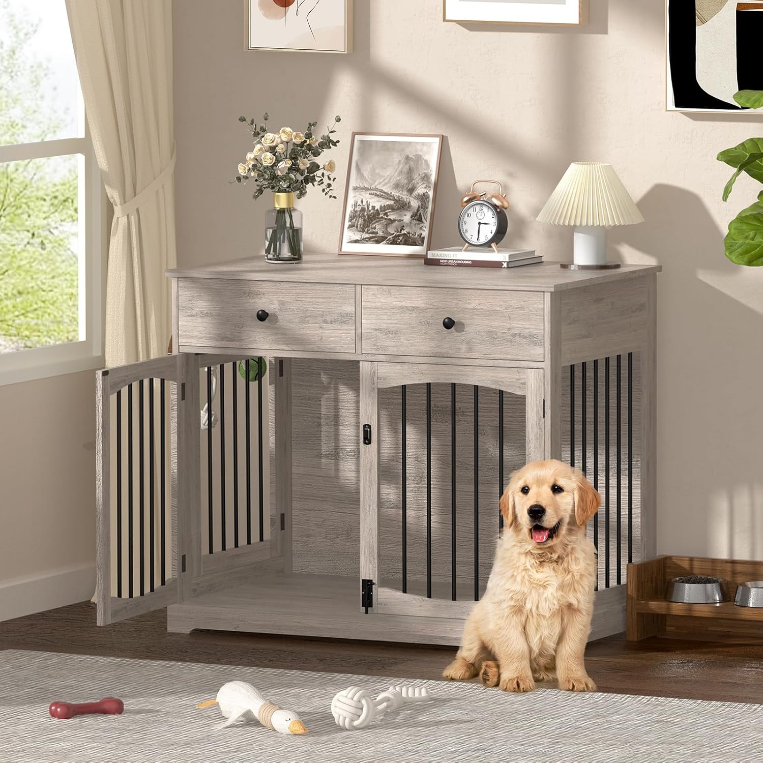 - Tons of Storage Space-Not just a kennel! Enjoy a sturdy top shelf that holds 150-200 lbs ideal for plants, photos, or decor. Two spacious drawers store food, toys, or treats, while side hooks keep leashes, collars, and pet essentials organized
