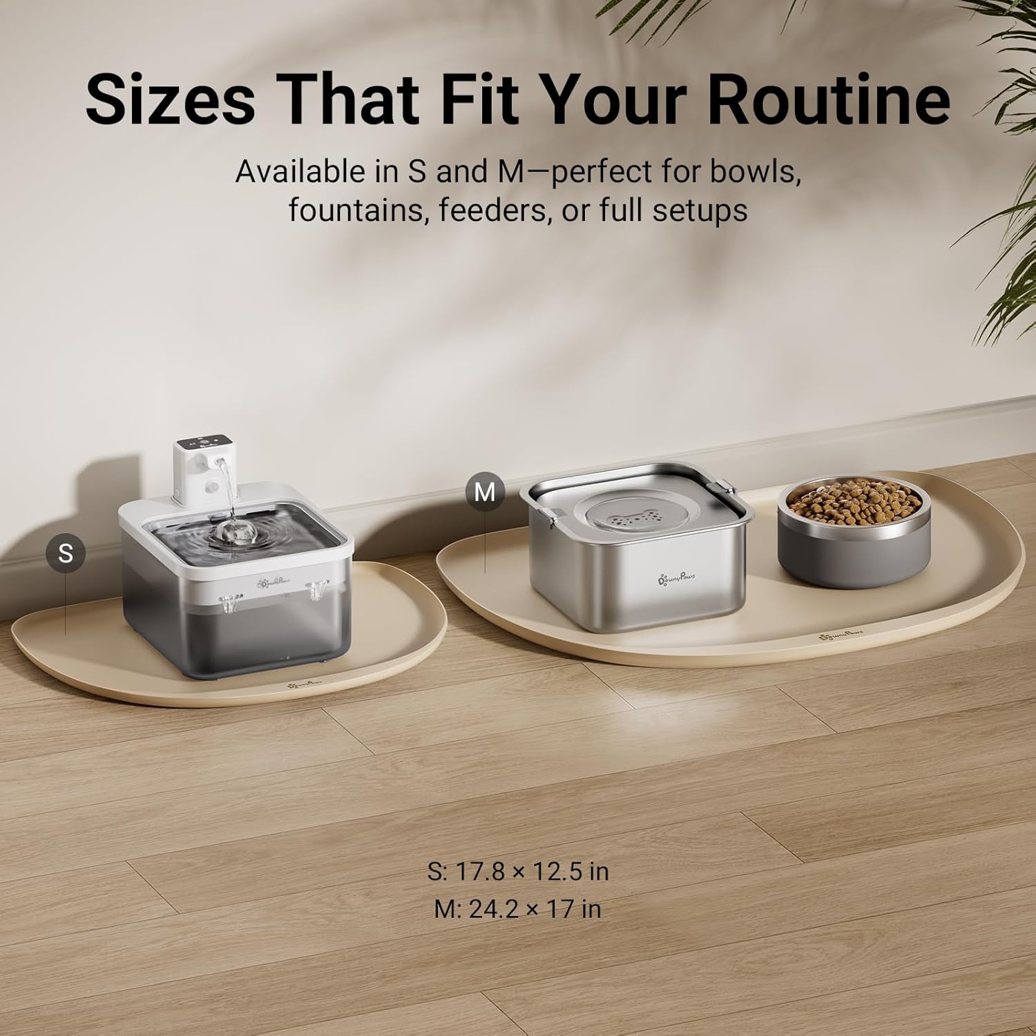 - Available in Two Sizes: Choose from two size options to suit your space and feeding setup. Sized to fit DownyPaws fountains or dog water bowl perfectly, while also compatible with most pet food and water bowls or feeder. (S: 17.8×12.5×0.6 in, M: 24.2×17×0.8 in)