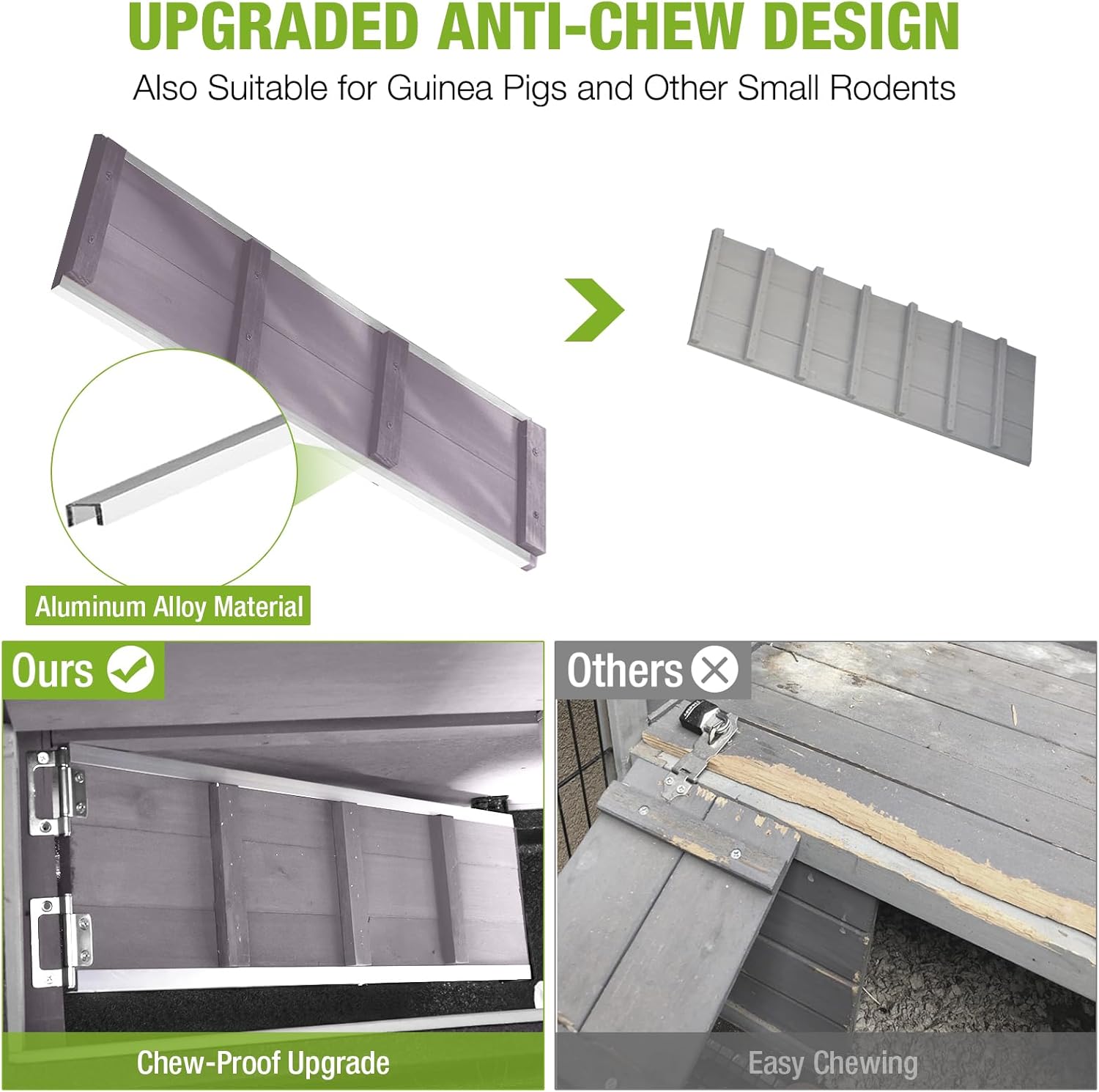 - Reinforced Chew-Proof Design: The access ramp features aluminum alloy-reinforced edges to discourage chewing by rabbits and other small pets, enhancing the rabbit hutch’s long-term durability. This sturdy design protects against wear and tear, ensuring lasting use.