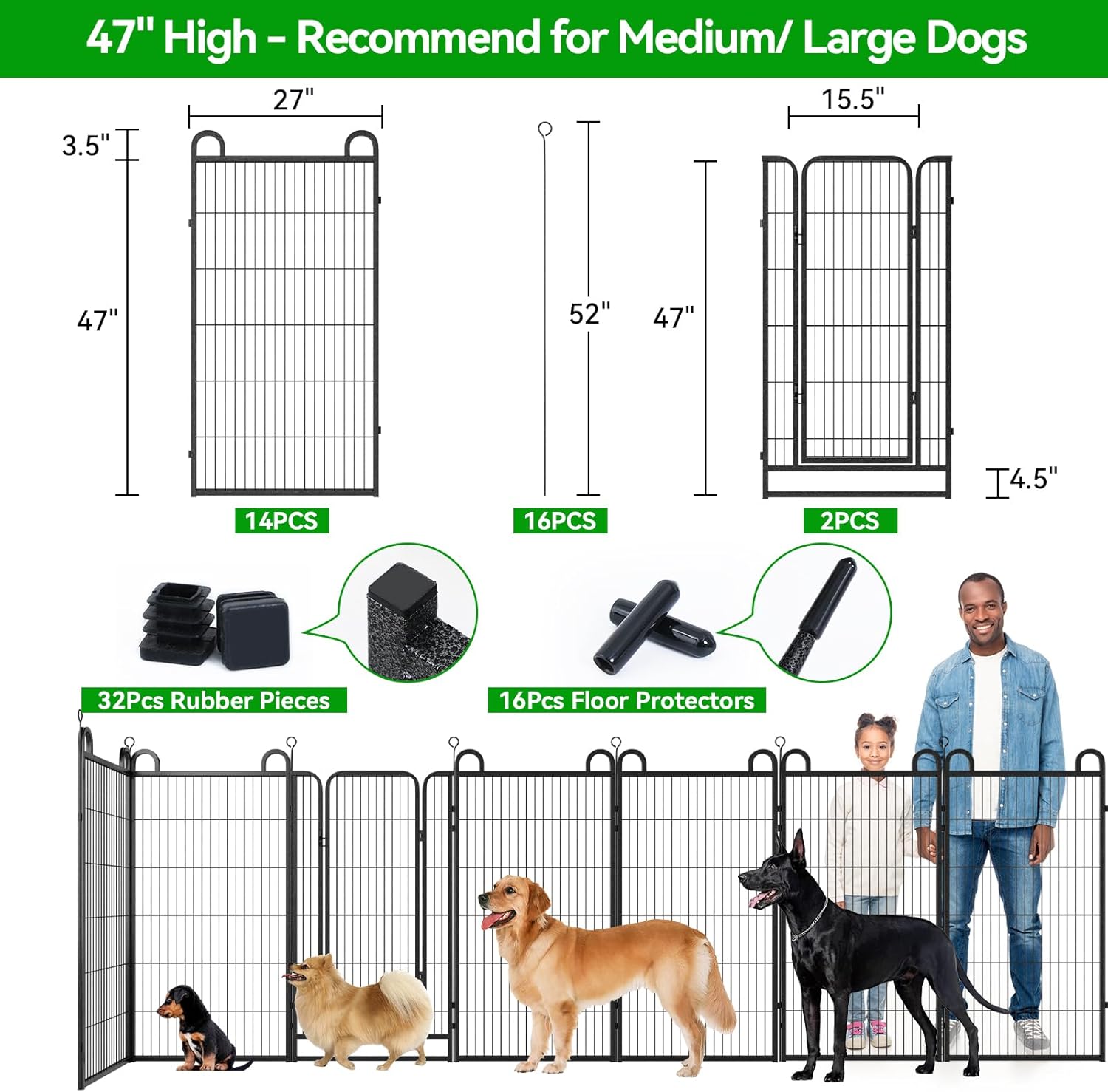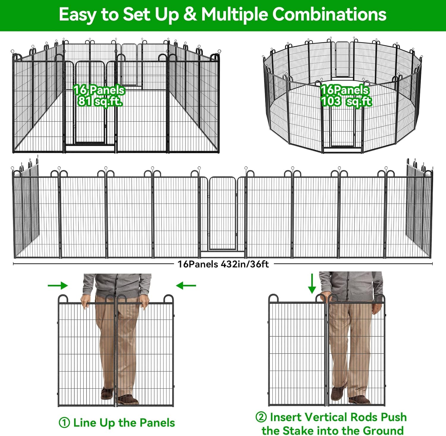 - 【Easy to Set Up & Multiple Combinations】The panels come with individual poles to connect them together, easy to set up or take it down in minutes, dog fence can do multiple combinations and configurations, dog playpen for the yard easily conforms to different shapes according to your garden or room, circle, polygon, irregular, etc