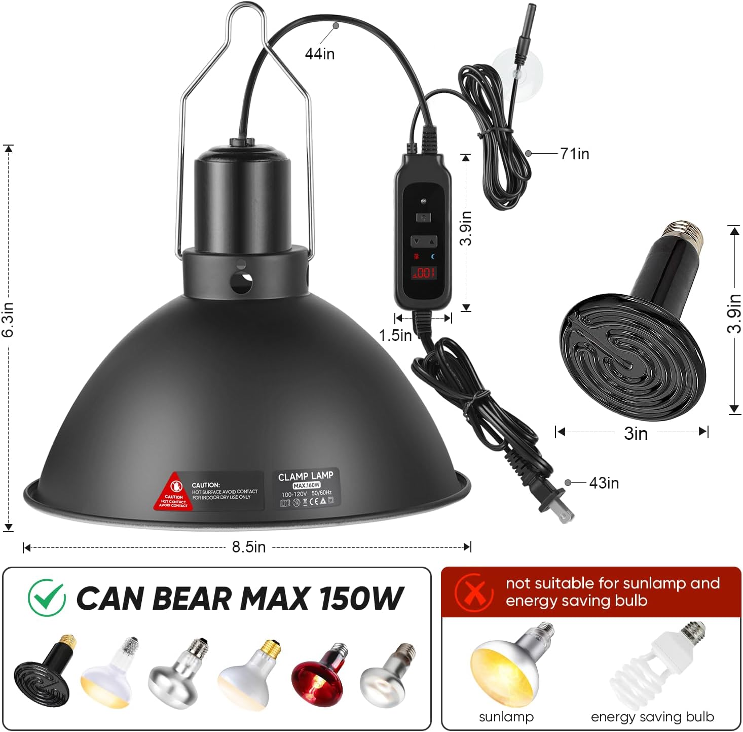 - High Reflection:Crafted from premium aluminum alloy with a thickness of 1mm, the inner layer of the deep dome reptile heat lamp fixture ensures durability. This bearded dragon light fixture has undergone meticulous polishing to optimize heat reflection and boost brightness. For efficient heat dissipation, The top of this bearded dragon heat lamp features ventilation holes, compatible with E26 lamp base, and capable of accommodating bulbs up to 150W in power.