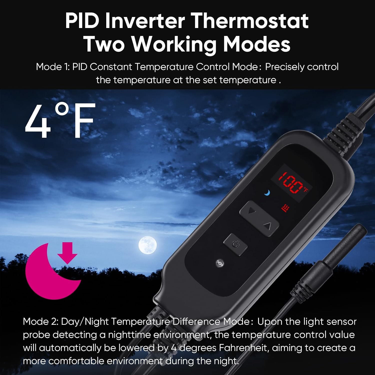 - Two Working Modes:The reptile heat lamp with dimming thermostat offers two operational modes: The PID constant temperature control mode enhances stability and efficiency in temperature regulation, extending the lifespan of the reptile heat bulb. The day/night temperature difference mode utilizes a light-sensitive probe to detect natural light variations, automatically reducing the temperature by approximately 4°F during the night. This creates a more natural, stable, and comfortable environment for reptiles.