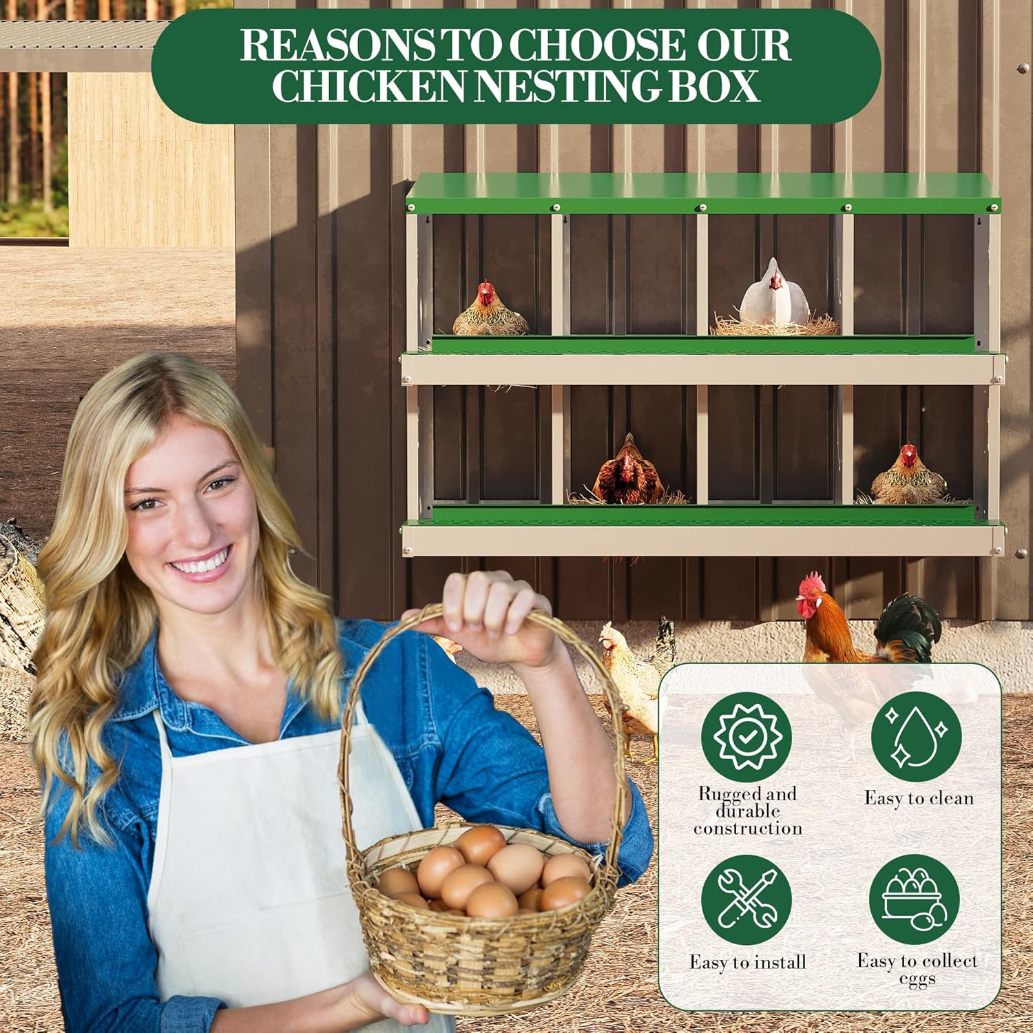 - Built to Last for Your Flock: Made from heavy-duty galvanized steel, this rustproof chicken nesting box stands strong against weather and wear, giving you years of reliable use so you can focus on happy, healthy hens instead of replacements