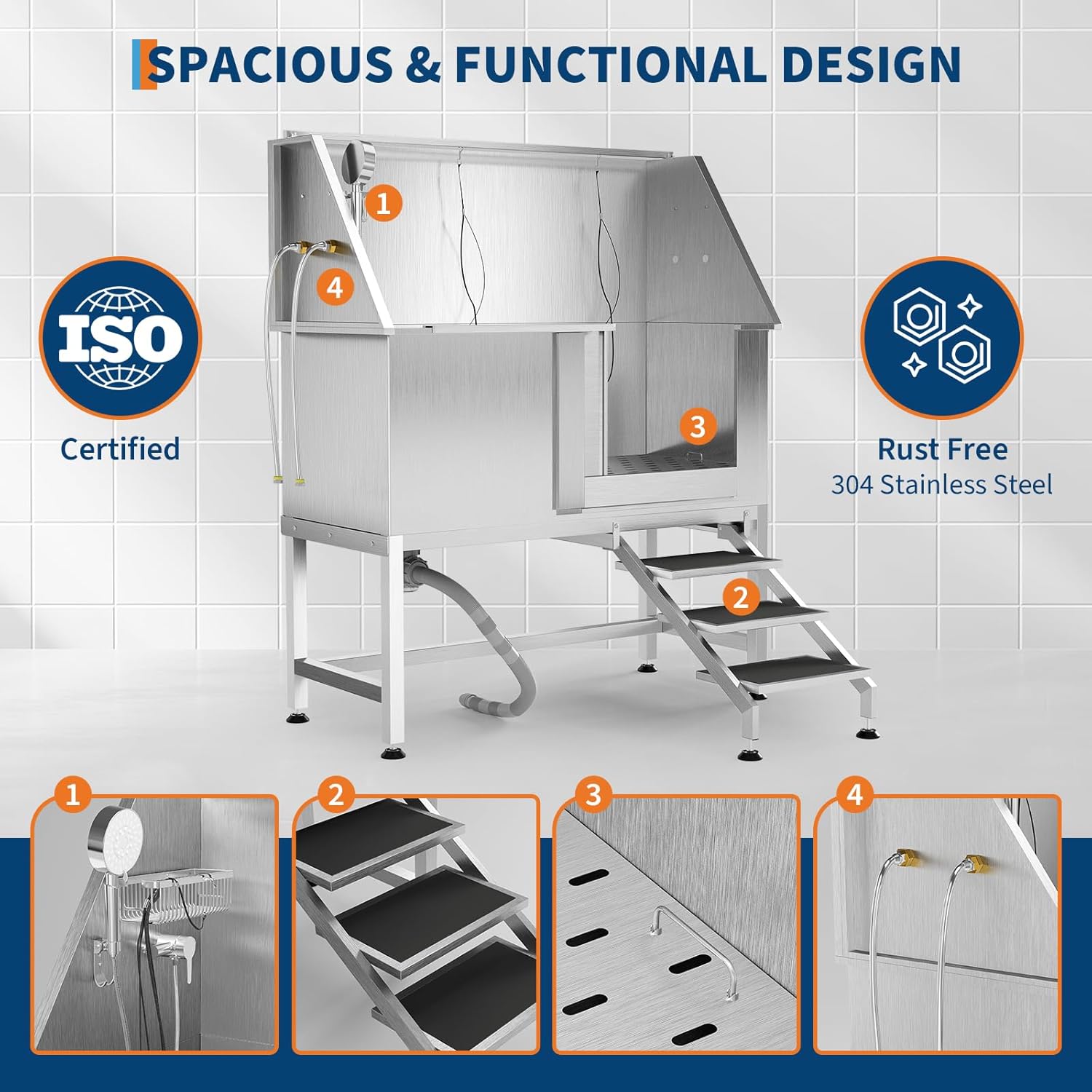 • Efficient Drainage System Removable floor grate prevents water accumulation and simplifies post-bath cleanup. Maintains tidy workspace during grooming sessions.