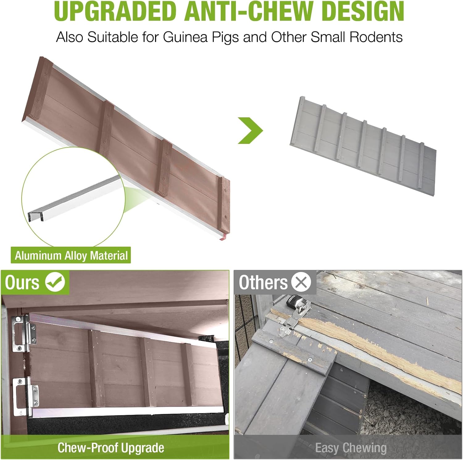 - Reinforced Chew-Proof Design: The access ramp features aluminum alloy-reinforced edges to discourage chewing by rabbits and other small pets, enhancing the rabbit hutch’s long-term durability. This sturdy design protects against wear and tear, ensuring lasting use