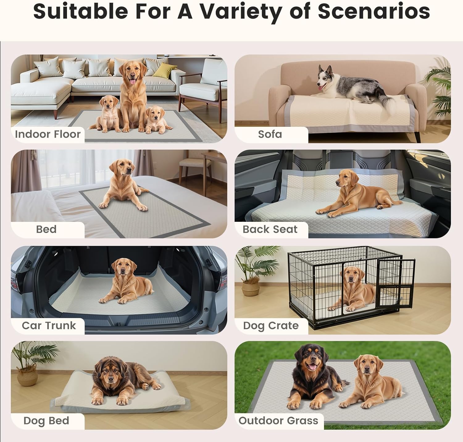 - Multiple Scenarios, Essential for Pet Owners: This xl puppy pads large is highly versatile. It can serve as training pads for dogs, pee pads for cats, senior dog potty pads, or postpartum care pad. Ideal for dog crates, cars, puppy trays, cat carriers, playpens, and covering spills from water/food bowls. Perfect for travel, outdoor use, hotels, public spaces, and daily walks. This pet pee pads meet nearly all pet needs—suitable for large puppies, dogs, cats, senior pets, kittens, rabbits, ducks, and more.