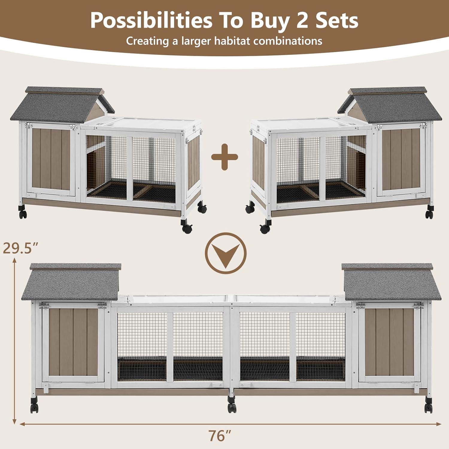 76''L Rabbit Hutch Outdoor Indoor with Wheels, Wooden 2 Story Bunny House Rabbit Cage with Run, Waterproof Roof, Pull Out Tray, Guinea Pig Cage Chicken Coop for Small to Medium Pets